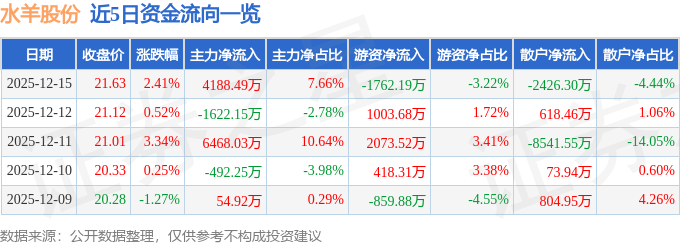 证券之星消息,截至2025年12月15日收盘,水羊股份(300740)报收于21.63元,上涨2.41%,换手率7.06%,成交量25.34万手,成交额5.47亿元。