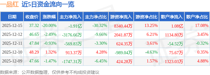证券之星消息,截至2025年12月15日收盘,一品红(300723)报收于37.32元,下跌20.0%,跌停,换手率4.03%,成交量16.85万手,成交额6.3亿元。