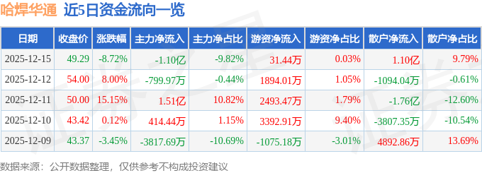 证券之星消息,截至2025年12月15日收盘,哈焊华通(301137)报收于49.29元,下跌8.72%,换手率12.32%,成交量22.19万手,成交额11.23亿元。