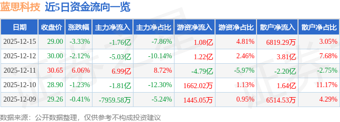 证券之星消息,截至2025年12月15日收盘,蓝思科技(300433)报收于29.0元,下跌3.33%,换手率1.54%,成交量76.56万手,成交额22.39亿元。