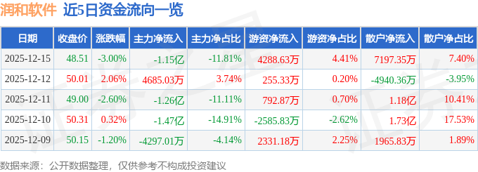 证券之星消息,截至2025年12月15日收盘,润和软件(300339)报收于48.51元,下跌3.0%,换手率2.55%,成交量19.83万手,成交额9.73亿元。