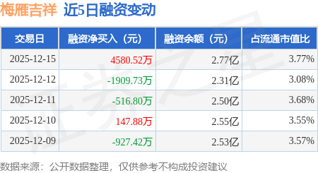 证券之星消息,12月15日,梅雁吉祥(600868)融资买入8910.82万元,融资偿还4330.3万元,融资净买入4580.52万元,融资余额2.77亿元。