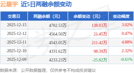 证券之星消息,12月15日,云星宇(920806)融资买入294.69万元,融资偿还156.66万元,融资净买入138.03万元,融资余额4702.53万元,近3个交易日已连续净买入累计370.91万元。