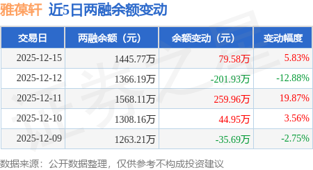 证券之星消息,12月15日,雅葆轩(920357)融资买入172.9万元,融资偿还93.32万元,融资净买入79.58万元,融资余额1445.77万元。
