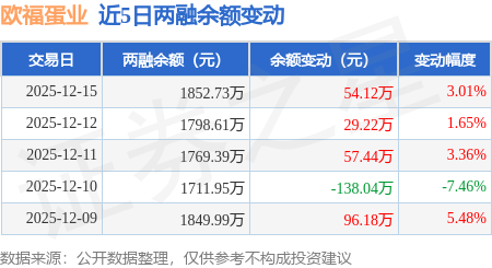 证券之星消息,12月15日,欧福蛋业(920371)融资买入230.63万元,融资偿还176.51万元,融资净买入54.12万元,融资余额1852.73万元,近3个交易日已连续净买入累计140.78万元,近20个交易日中有12个交易日出现融资净买入。