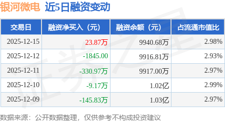 证券之星消息,12月15日,银河微电(688689)融资买入250.35万元,融资偿还226.48万元,融资净买入23.87万元,融资余额9940.68万元。
