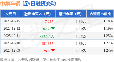 证券之星消息,12月15日,中集车辆(301039)融资买入1230.88万元,融资偿还1223.63万元,融资净买入7.25万元,融资余额1.81亿元。