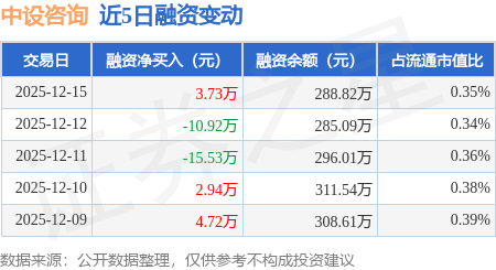 证券之星消息,12月15日,中设咨询(920873)融资买入3.75万元,融资偿还0.02万元,融资净买入3.73万元,融资余额288.82万元。
