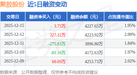证券之星消息,12月15日,聚胶股份(301283)融资买入628.95万元,融资偿还625.22万元,融资净买入3.73万元,融资余额4227.65万元。