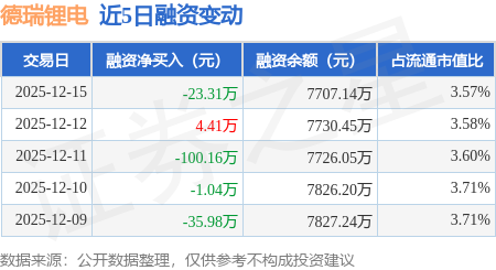 证券之星消息,12月15日,德瑞锂电(920523)融资买入372.36万元,融资偿还395.67万元,融资净卖出23.31万元,融资余额7707.14万元,近20个交易日中有11个交易日出现融资净买入。