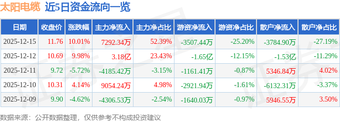 12月15日的资金流向数据方面,主力资金净流入7292.34万元,占总成交额52.39%,游资资金净流出3507.44万元,占总成交额25.2%,散户资金净流出3784.9万元,占总成交额27.19%。