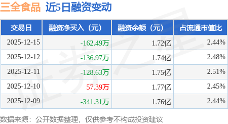 证券之星消息,12月15日,三全食品(002216)融资买入240.07万元,融资偿还402.56万元,融资净卖出162.49万元,融资余额1.72亿元。