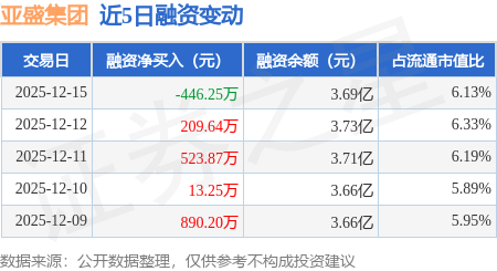 证券之星消息,12月15日,亚盛集团(600108)融资买入1077.75万元,融资偿还1524.01万元,融资净卖出446.25万元,融资余额3.69亿元。