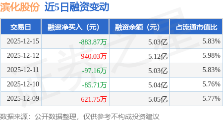 证券之星消息,12月15日,滨化股份(601678)融资买入1286.33万元,融资偿还2170.19万元,融资净卖出883.87万元,融资余额5.03亿元,近20个交易日中有12个交易日出现融资净买入。