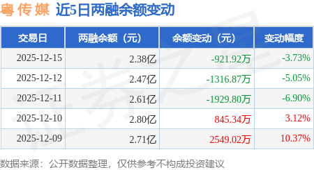 证券之星消息,12月15日,粤 传 媒(002181)融资买入1293.98万元,融资偿还2217.85万元,融资净卖出923.87万元,融资余额2.37亿元。