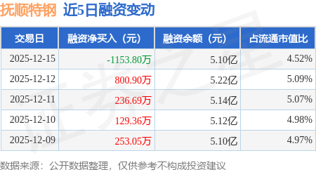 证券之星消息,12月15日,抚顺特钢(600399)融资买入8026.64万元,融资偿还9180.44万元,融资净卖出1153.8万元,融资余额5.1亿元,近20个交易日中有11个交易日出现融资净买入。