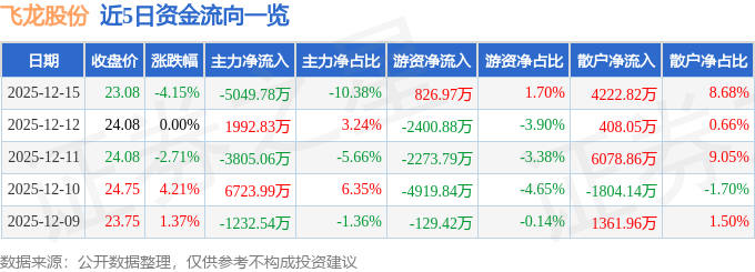 12月15日的资金流向数据方面,主力资金净流出5049.78万元,占总成交额10.38%,游资资金净流入826.97万元,占总成交额1.7%,散户资金净流入4222.82万元,占总成交额8.68%。