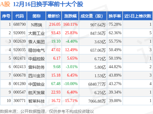 当日A股换手率前10大个股中7只个股收涨,平均涨幅33.23%,其中N昂瑞(688790)以换手率75.28%排第一,5只个股近5个交易日中多次上榜。