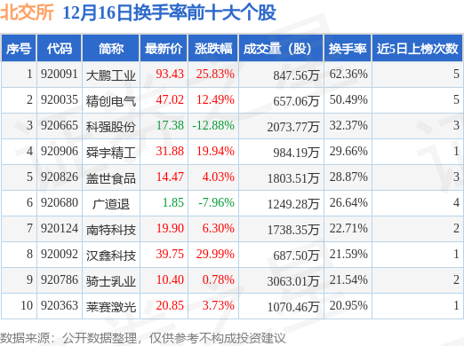 当日北交所换手率前10大个股中8只个股收涨,平均涨幅12.89%,其中大鹏工业(920091)以换手率62.36%排第一,7只个股近5个交易日中多次上榜。