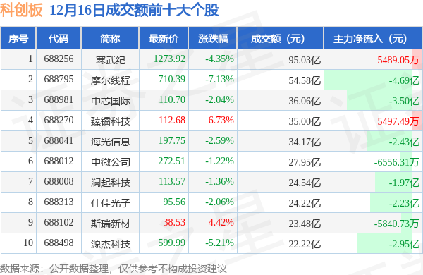 当日科创板成交额前10大个股中2只个股收涨,平均涨幅5.58%,其中寒武纪(688256)以成交额95.03亿元排第一。从主力资金流入看,成交额前10大个股中有2只个股呈现主力资金净流入。