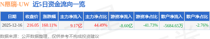 证券之星消息,截至2025年12月16日收盘,N昂瑞(688790)报收于216.05元,上涨160.11%,换手率75.28%,成交量9.08万手,成交额20.61亿元。