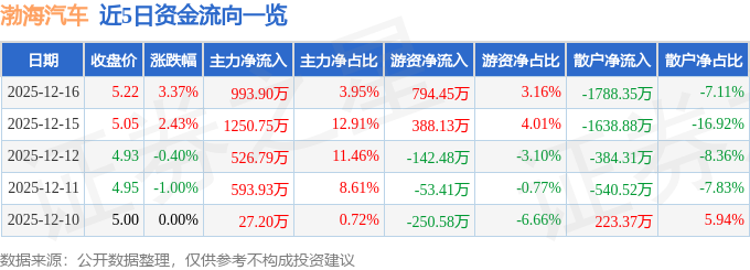 证券之星消息,截至2025年12月16日收盘,渤海汽车(600960)报收于5.22元,上涨3.37%,换手率5.07%,成交量48.18万手,成交额2.52亿元。