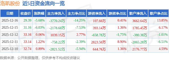 证券之星消息,截至2025年12月16日收盘,洛凯股份(603829)报收于29.39元,下跌5.68%,换手率4.74%,成交量8.83万手,成交额2.65亿元。
