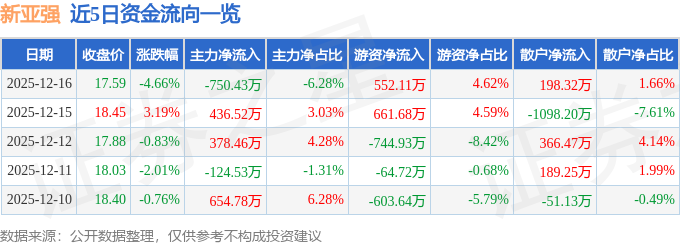 证券之星消息,截至2025年12月16日收盘,新亚强(603155)报收于17.59元,下跌4.66%,换手率2.14%,成交量6.76万手,成交额1.19亿元。