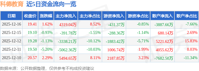 证券之星消息,截至2025年12月16日收盘,科德教育(300192)报收于19.41元,上涨1.62%,换手率7.99%,成交量25.93万手,成交额5.07亿元。