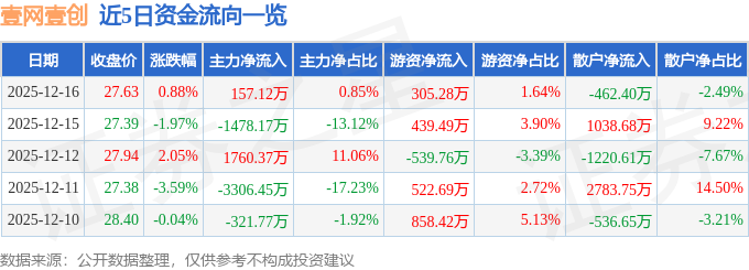 证券之星消息,截至2025年12月16日收盘,壹网壹创(300792)报收于27.63元,上涨0.88%,换手率3.16%,成交量6.72万手,成交额1.86亿元。
