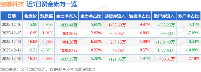 证券之星消息,截至2025年12月16日收盘,宝鼎科技(002552)报收于15.98元,下跌5.94%,换手率2.46%,成交量9.08万手,成交额1.47亿元。