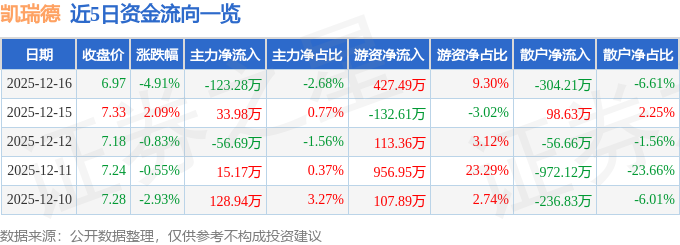 证券之星消息,截至2025年12月16日收盘,凯瑞德(002072)报收于6.97元,下跌4.91%,换手率2.19%,成交量6.49万手,成交额4599.08万元。
