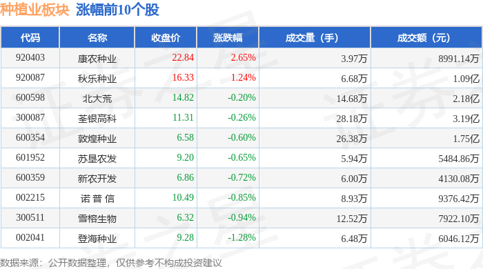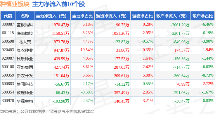 从资金流向上来看,当日种植业板块主力资金净流出1.79亿元,游资资金净流入4763.66万元,散户资金净流入1.31亿元。种植业板块个股资金流向见下表: