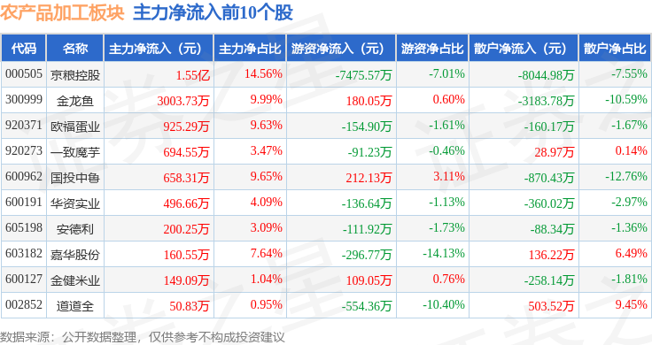 从资金流向上来看,当日农产品加工板块主力资金净流入6841.12万元,游资资金净流出5192.11万元,散户资金净流出1649.01万元。农产品加工板块个股资金流向见下表: