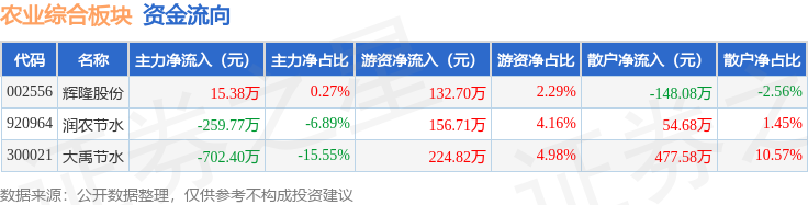 从资金流向上来看,当日农业综合板块主力资金净流出687.02万元,游资资金净流入357.52万元,散户资金净流入329.5万元。农业综合板块个股资金流向见下表: