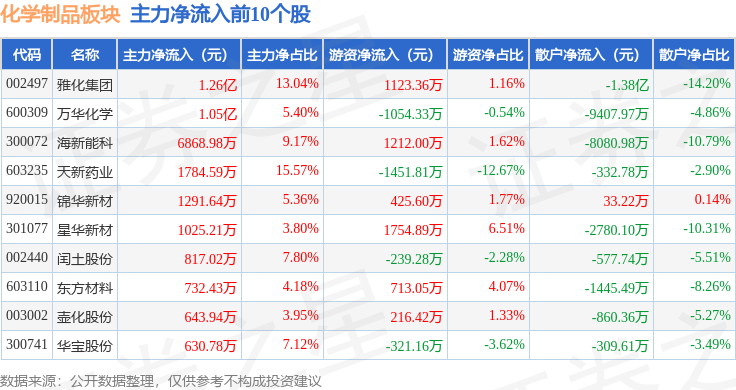 从资金流向上来看,当日化学制品板块主力资金净流出13.77亿元,游资资金净流入1.21亿元,散户资金净流入12.57亿元。化学制品板块个股资金流向见下表: