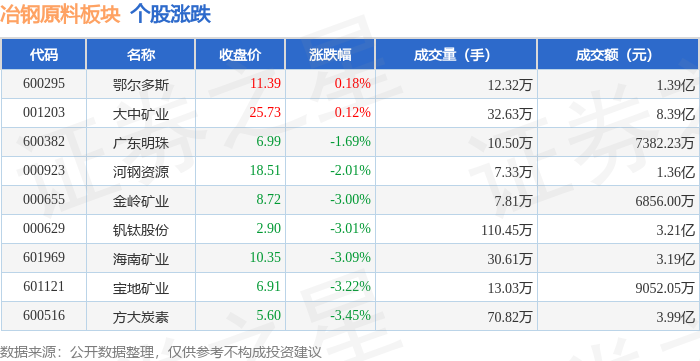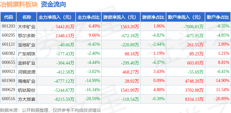 从资金流向上来看,当日冶钢原料板块主力资金净流出1.24亿元,游资资金净流入2379.56万元,散户资金净流入1.0亿元。冶钢原料板块个股资金流向见下表: