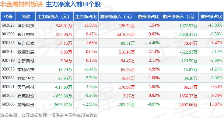 从资金流向上来看,当日非金属材料板块主力资金净流出1.09亿元,游资资金净流入6798.66万元,散户资金净流入4127.2万元。非金属材料板块个股资金流向见下表: