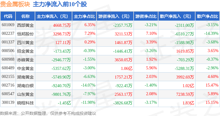 从资金流向上来看,当日贵金属板块主力资金净流出5.61亿元,游资资金净流入1.93亿元,散户资金净流入3.68亿元。贵金属板块个股资金流向见下表: