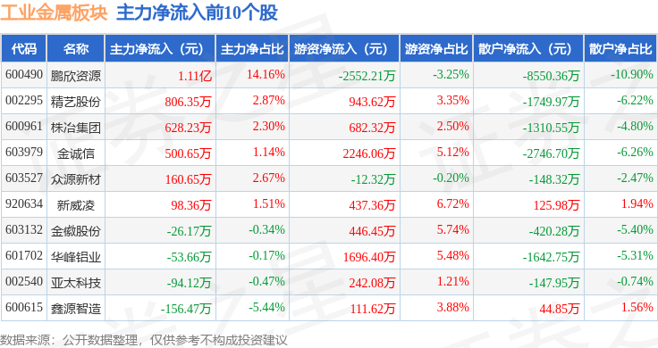 从资金流向上来看,当日工业金属板块主力资金净流出35.34亿元,游资资金净流入8.58亿元,散户资金净流入26.76亿元。工业金属板块个股资金流向见下表: