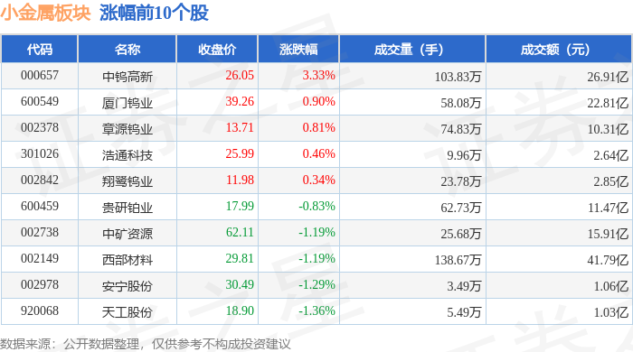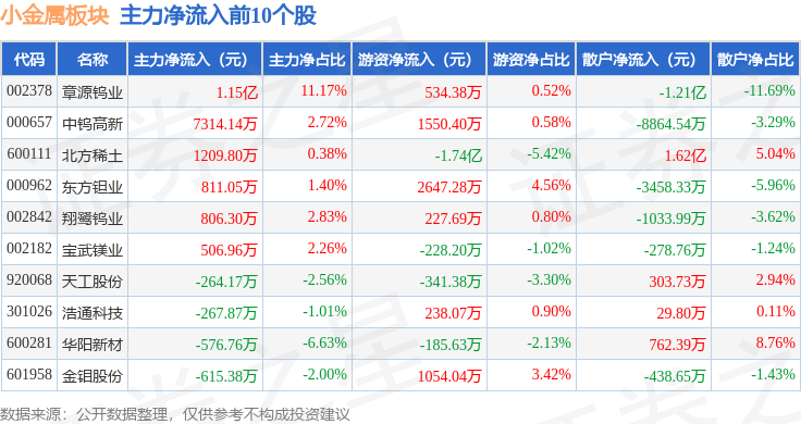 从资金流向上来看,当日小金属板块主力资金净流出17.7亿元,游资资金净流入3.72亿元,散户资金净流入13.98亿元。小金属板块个股资金流向见下表: