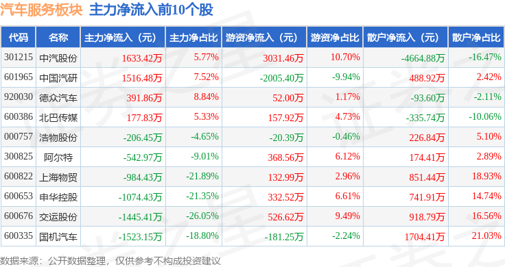 从资金流向上来看,当日汽车服务板块主力资金净流出6519.26万元,游资资金净流入746.52万元,散户资金净流入5772.74万元。汽车服务板块个股资金流向见下表: