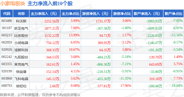从资金流向上来看,当日小家电板块主力资金净流入1638.04万元,游资资金净流入2271.18万元,散户资金净流出3909.22万元。小家电板块个股资金流向见下表: