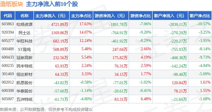 从资金流向上来看,当日造纸板块主力资金净流出2.83亿元,游资资金净流出5556.27万元,散户资金净流入3.38亿元。造纸板块个股资金流向见下表: