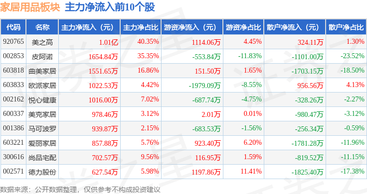 从资金流向上来看,当日家居用品板块主力资金净流出1.25亿元,游资资金净流入2510.38万元,散户资金净流入9986.94万元。家居用品板块个股资金流向见下表: