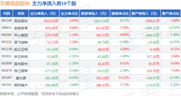 从资金流向上来看,当日文娱用品板块主力资金净流出1.1亿元,游资资金净流出950.92万元,散户资金净流入1.19亿元。文娱用品板块个股资金流向见下表: