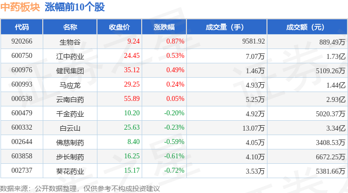 证券之星消息,12月16日中药板块较上一交易日下跌1.29%,*ST长药领跌。当日上证指数报收于3824.81,下跌1.11%。深证成指报收于12914.67,下跌1.51%。中药板块个股涨跌见下表: