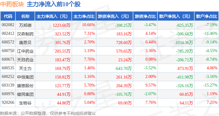 从资金流向上来看,当日中药板块主力资金净流出8.48亿元,游资资金净流入7596.09万元,散户资金净流入7.72亿元。中药板块个股资金流向见下表: