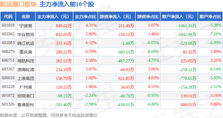 从资金流向上来看,当日航运港口板块主力资金净流出4.62亿元,游资资金净流入5704.32万元,散户资金净流入4.05亿元。航运港口板块个股资金流向见下表: