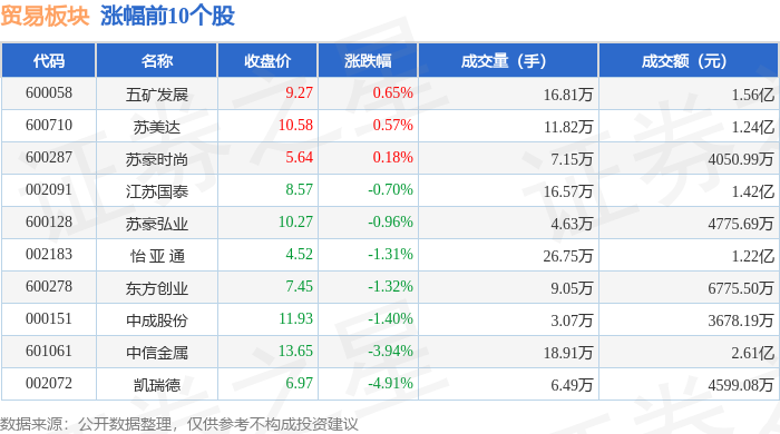 证券之星消息,12月16日贸易板块较上一交易日下跌1.63%,苏豪汇鸿领跌。当日上证指数报收于3824.81,下跌1.11%。深证成指报收于12914.67,下跌1.51%。贸易板块个股涨跌见下表: